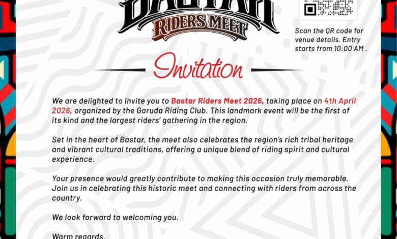 कार्यक्रम में प्रवेश सुबह 10 बजे से प्रारंभ होगा और आयोजन स्थल से जुड़ी विस्तृत जानकारी के लिए क्यूआर कोड की व्यवस्था भी की गई है।  “बस्तर राइडर्स मीट 2026” का उद्देश्य राइडिंग समुदाय को एक मंच पर लाना, युवाओं में एडवेंचर स्पोर्ट्स के प्रति रुचि बढ़ाना और बस्तर को एक प्रमुख पर्यटन गंतव्य के रूप में स्थापित करना है।